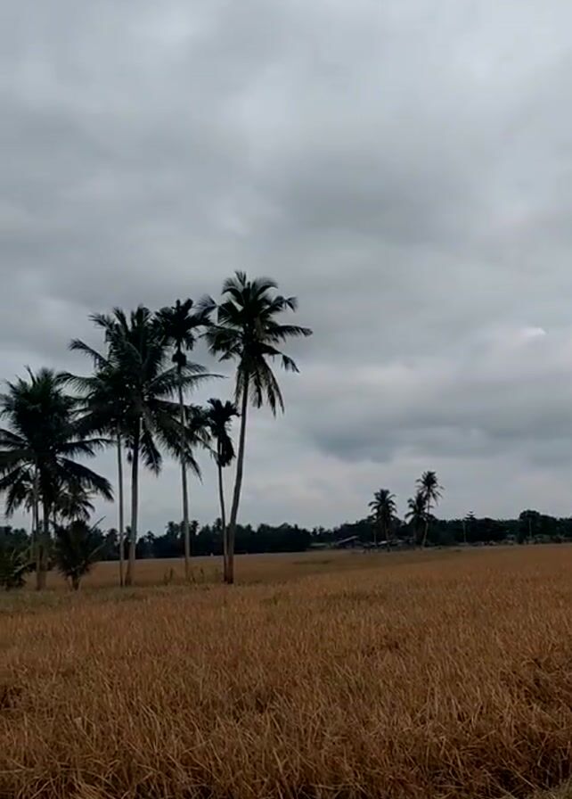 wide-angle shot of a golden field of harvested rice paddies under a cloudy sky. A stand of palm trees dots the center-left of the frame. There's a distant line of green trees along the horizon. The camera is static throughout the video.