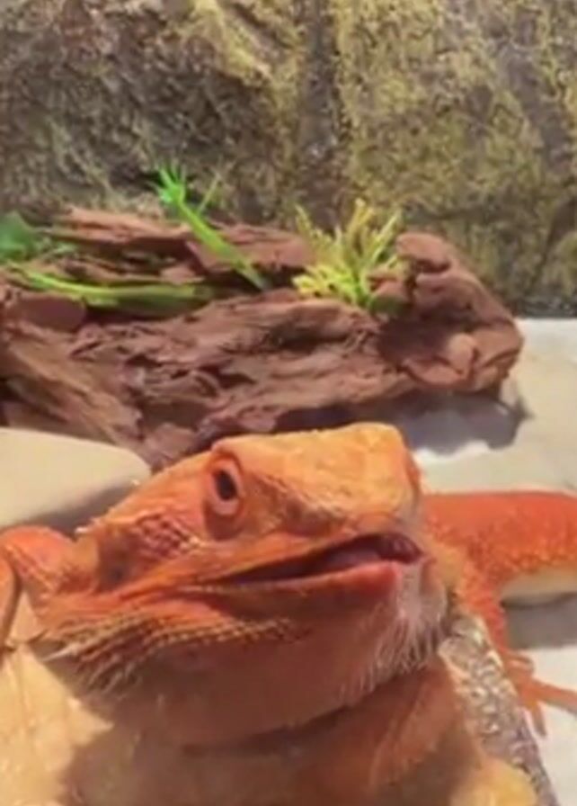 An orange-colored bearded dragon is visible from the chest up