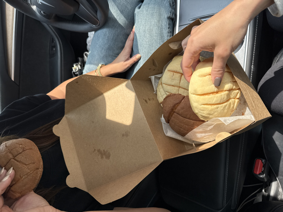 An interior view of a Tesla vehicle, located in Monterrey, Mexico, shows two individuals sharing Mexican sweet bread known as conchas