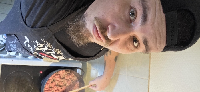 A male subject, wearing a black baseball cap, black t-shirt, and a black apron with a multi-colored graphic design, is depicted in what appears to be a residential kitchen. The specific city location of Käerjeng, Luxembourg, is not identifiable from the image. The man has a goatee, a mustache, and a visible tattoo on his right upper arm. His face is angled towards the camera, with a slight puckering of the lips. His right hand holds a light-colored wooden spoon, which is actively stirring browned ground meat within a dark-colored pot. The pot rests on a black electric induction stovetop. The background consists of light-colored, possibly beige or white, tiled walls.
