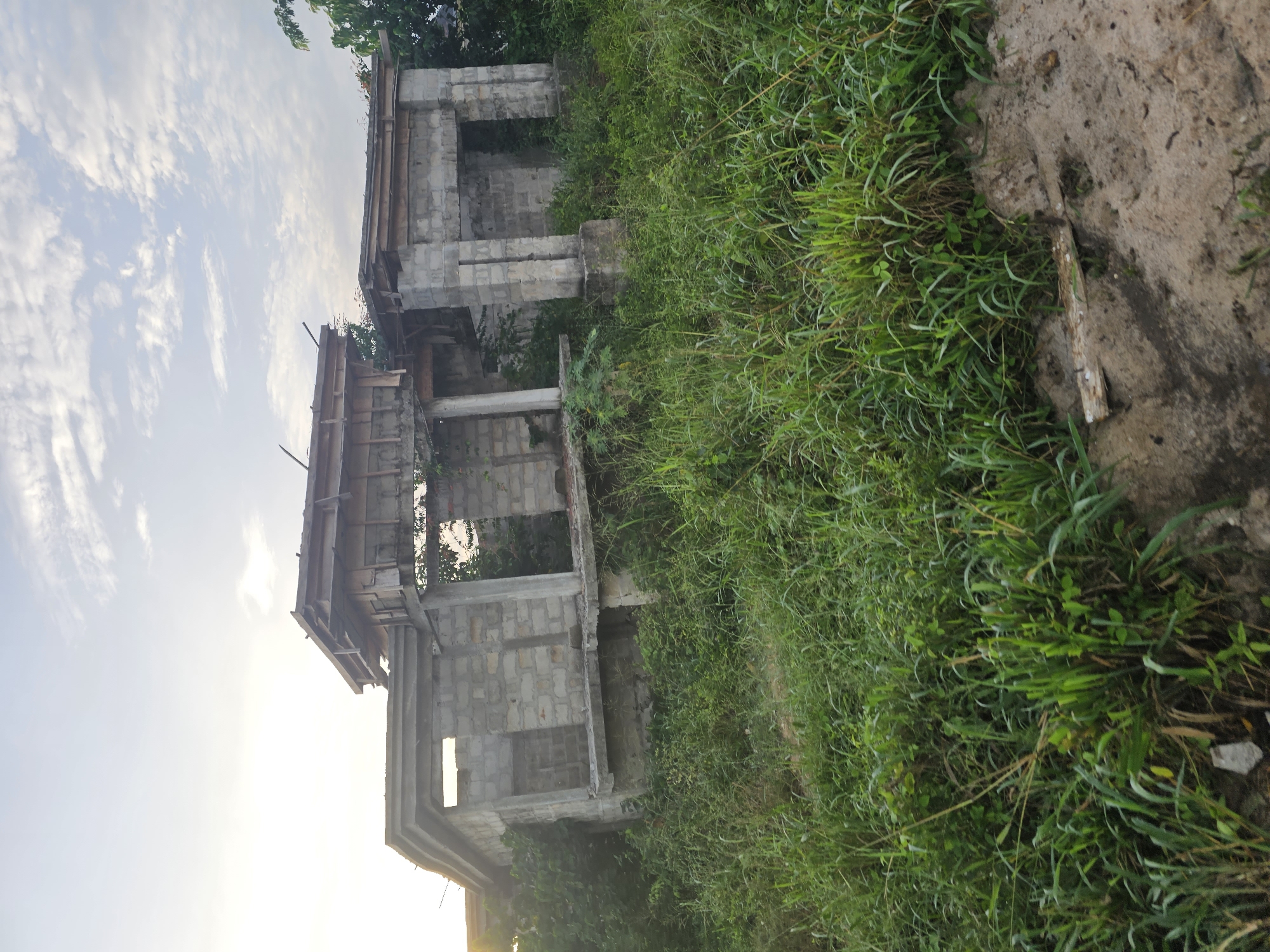 two unfinished, concrete block structures in an overgrown, grassy area. The structures appear to be buildings under construction, but currently lack roofs and windows. One structure has a partially constructed wooden roof frame. The location appears to be rural or suburban, with dense vegetation surrounding the buildings. The sky is visible in the background, with scattered clouds. The light suggests either early morning or late afternoon. There are no people visible in the scene. The location is in the city of Unknown, Unknown.