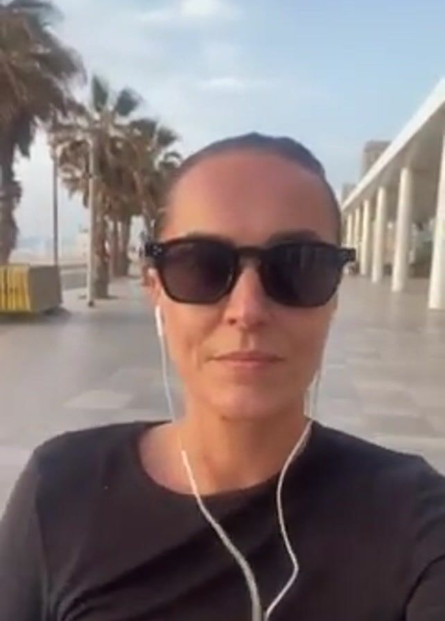 A woman wearing sunglasses and a black shirt is standing outside, facing the camera. She has white wired earbuds in. Behind her is a concrete walkway lined with palm trees and a sandy beach next to a body of water. A building is visible behind the trees. The sky is blue with some clouds.