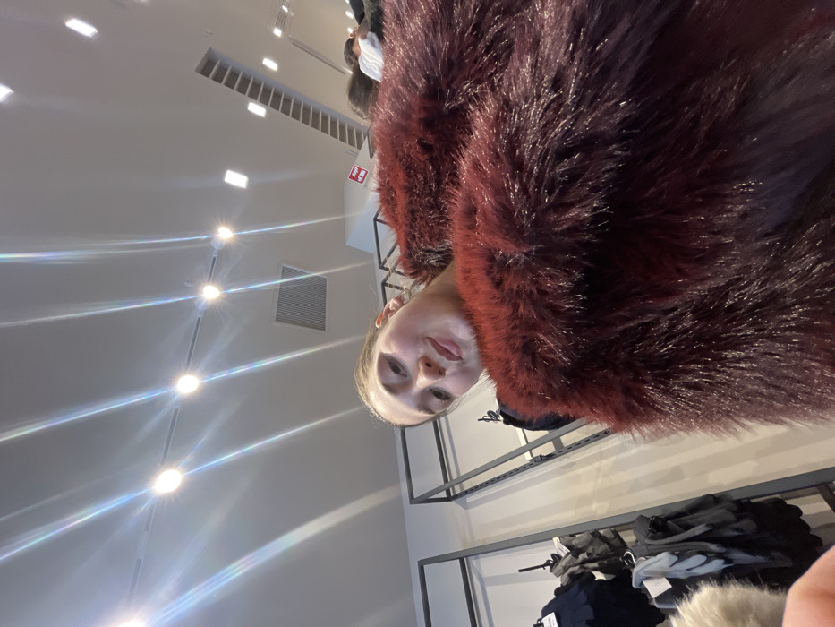 A tilted view shows a person in a fuzzy, burgundy jacket. The person's face is visible and appears to be looking at the camera. The background suggests a retail environment, with visible clothing racks and merchandise. Overhead lighting adds streaks of light across the scene. Other shoppers are visible in the far background.
