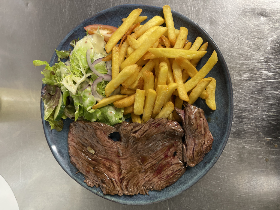 A top-down view depicts a meal served on a dark blue, speckled ceramic plate resting on a reflective, brushed metallic surface, characteristic of a commercial kitchen countertop. The plate holds three main components. On the left, a large, irregularly shaped portion of sliced steak exhibits a medium-rare doneness, featuring a reddish-pink interior and a seared brown exterior. To the right of the steak, a substantial pile of golden-brown french fries is visible. Positioned above the fries and adjacent to the steak is a small side salad composed of mixed green lettuce, thinly sliced red onion, cucumber pieces, and a tomato segment, all coated with a creamy, pale yellow dressing containing small dark specks. A blurred, lighter-toned object is partially visible in the upper background. The image provides no identifiable visual cues to determine its specific location within Strasbourg, France.