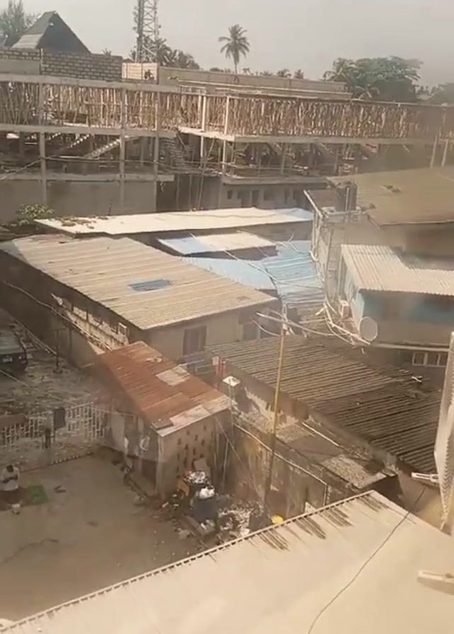 The video is a high-angle shot taken outdoors, providing a view of a densely populated urban area. In the foreground and midground are a cluster of buildings with diverse roof types, including corrugated metal and flat surfaces. These buildings appear to be residential or small commercial structures. In the background, a multi-story building under construction is visible. The framework of the building is exposed, revealing the structure's skeleton. A telecommunications tower rises above the other structures in the vicinity. The sky is overcast, with muted sunlight filtering through the clouds. In the center of the frame, a man is performing some kind of exercise on a paved surface between buildings. Various objects and vehicles are scattered around the area, adding to the cluttered scene. The camera is stationary. The overall impression is of a bustling, densely populated area with ongoing construction and everyday activities.