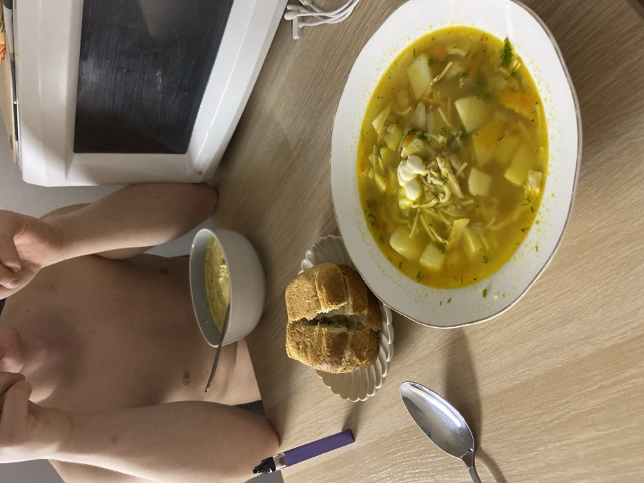 The scene depicts an indoor setting, likely a dining area, in Vsevolozhsk, Russia. A shirtless individual, visible from the chest up, is seated at a light-colored wooden table, with their forearms resting on the surface and hands positioned near their mouth. On the table, in the foreground, a large white bowl with a gold rim contains a yellow soup with visible chunks of potato, carrot, shredded chicken, thin noodles, fresh green herbs, and a dollop of white cream on top. To the left of this bowl, a small white scalloped plate holds a piece of bread, split vertically down the middle. Further to the left, a silver spoon lies on the table, and a purple vape pen stands upright. In the background, to the left of the seated individual, a smaller light grey bowl containing a yellow soup or puree with a spoon inside is present. To the right of the seated individual, a white microwave oven rests on the table, and a coiled white cable is visible near it. The background wall is a light, uniform color.