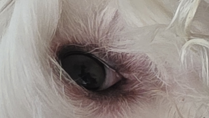 - "A close-up depicts the eye of an animal, likely a dog, framed by white fur" by FM-etvNA2, licensed under CC BY 4.0