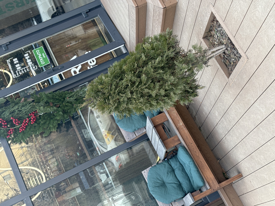 The image depicts an outdoor seating area in front of R-Cafe, located at Kirova Street, 10, Voronezh, Russia. The foreground features a light brown composite decking material. On the left, a dark wooden bench with two distinct seating sections, each fitted with a teal-colored cushion, is visible. An integrated small table with a light grey surface is positioned between the two seating sections of the bench. Centrally positioned, a small evergreen conifer, consistent with a Thuja, is planted in a rectangular cutout within the decking, surrounded by dark mulch. The background comprises the facade of the establishment, characterized by large, dark-framed glass windows and a matching glass door. The door displays a green sign reading "ОТКРЫТО" (OPEN) in Cyrillic, with "OPEN" in English below it. Reflections on the glass surfaces reveal elements of the street scene, including a white vehicle with yellow taxi markings, indicative of a Yandex Taxi, and reflections of other buildings. Vertical evergreen garlands adorned with red berries are affixed to the facade, suggesting decorative or seasonal embellishments. No individuals are present in the scene.