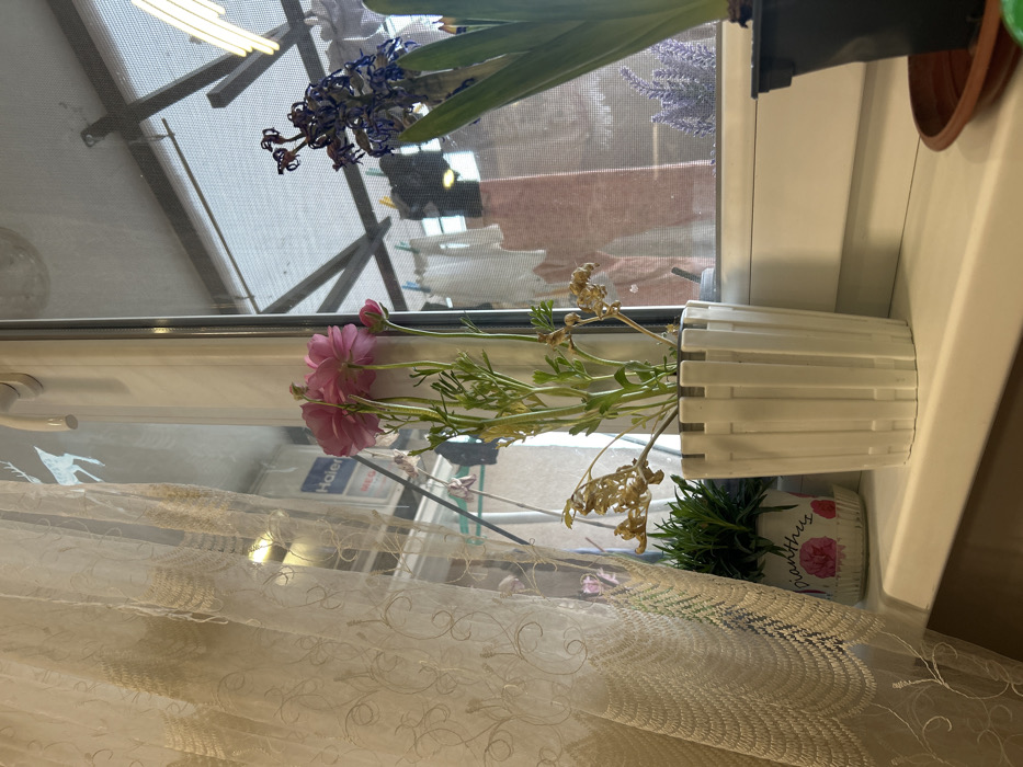 The image provides an interior view from a window in Sofia, Bulgaria, looking out onto a covered exterior space. On the white windowsill, three potted plants are visible: a small green plant in a white pot with a partial "DIANTHUS" inscription; a taller plant displaying multiple pink flowers and significant withered brown foliage in a white, vertically-ridged planter; and a plant with broad green leaves and a dried, blue floral stalk in a black pot with a terracotta-colored saucer. To the left, a translucent white curtain with embroidered patterns partially obscures the view. A white decorative reindeer silhouette is affixed to the upper left section of the white window frame. Through the window, an outdoor structure with a translucent corrugated roof and supporting beams is evident. A clothesline is strung across this area, holding various garments including white shirts, dark clothing, and a pink fabric, secured by clothes pegs. Reflections on the window glass reveal portions of a blue "Haier" sign and a red "MEGA" sign. A purple, possibly artificial, plant is visible on an exterior surface below the clothesline.