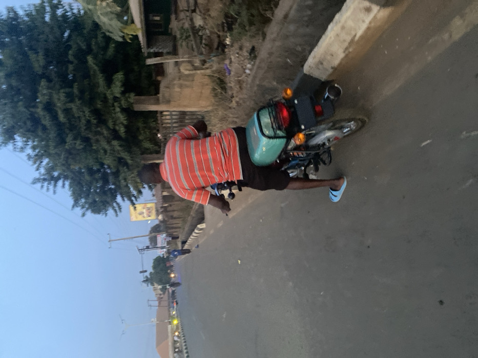 A man in a striped orange shirt and black shorts sits astride a parked motorcycle on the side of a road. He wears light blue sandals. The motorcycle has a turquoise storage box. Trees line the opposite side of the road, which appears to be on a slight decline. Distant buildings and utility poles are visible in the background under a pale sky. The photograph is taken from a slightly elevated angle and rotated 90 degrees clockwise.