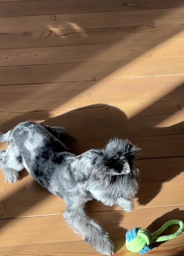 small, speckled dog on a wooden floor. The dog is mostly grey with black spots and some white, and it has a short tail. It gets up from a lying position and picks up a small green and blue toy with its mouth. The dog then trots away to the right of the frame, carrying the toy. The floor is made of light-colored wooden planks, and there are streaks of sunlight on the floor.