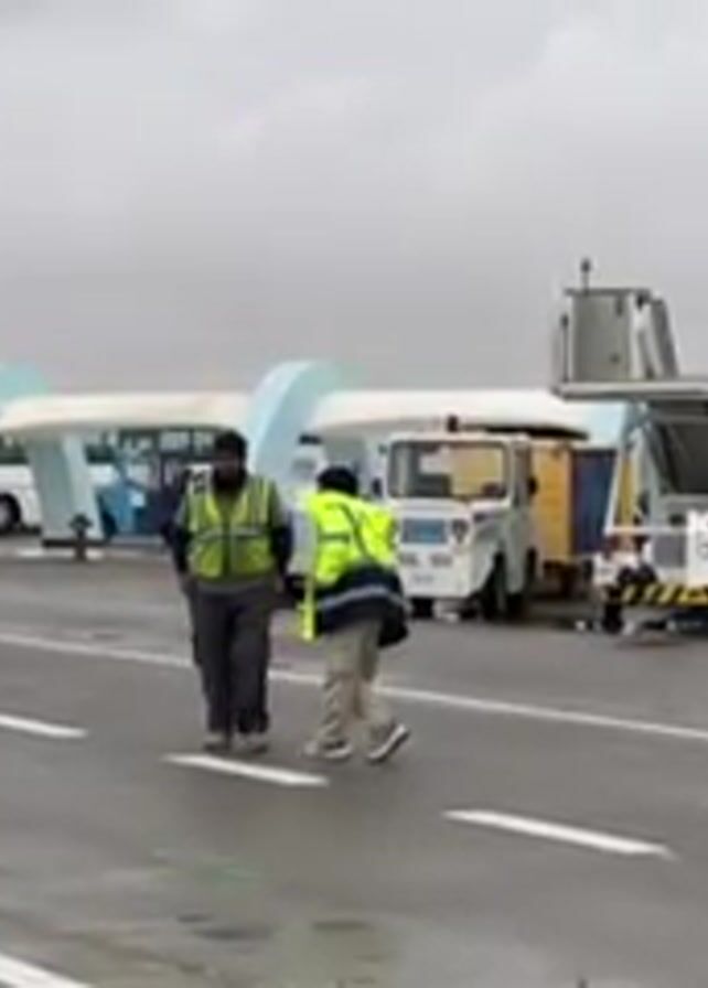 two people in high-visibility vests walking on a wet paved surface marked with white lines. They are near airport support vehicles, including passenger boarding stairs and a small truck. In the background, there's a covered waiting area with buses and a few other individuals. The sky is overcast and the overall environment suggests an airport tarmac on a wet day.