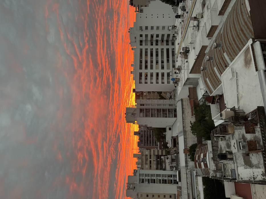 An aerial view depicts a dense urban environment in Cordoba, Argentina, under a dramatic sky. The upper third of the image shows a grey-blue sky, transitioning downwards into a vibrant expanse of red and orange, indicative of either sunrise or sunset. Horizontal, wave-like clouds are present across the entire sky, intensely illuminated in the lower, colorful portion. The cityscape below consists predominantly of multi-story buildings. In the midground, several large, white residential buildings with numerous rectangular windows and balconies are prominent. Their facades are evenly lit by the ambient light. Further into the background, a cluster of darker, multi-story buildings extends towards the horizon. The foreground features an intricate network of rooftops. These include flat concrete surfaces supporting light-colored water tanks, air conditioning units, and ventilation equipment. A distinctive, curved roof constructed from corrugated metal, exhibiting rust-colored and white sections, is also visible. No individuals are discernible within the frame. The scene is static, capturing the urban landscape bathed in the unique light of dawn or dusk.