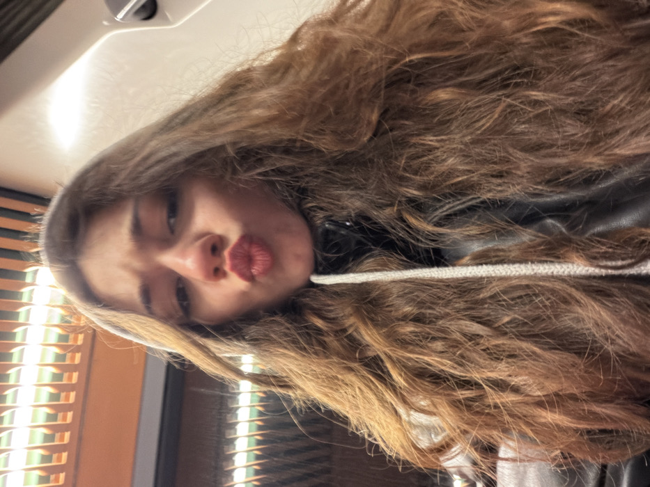 A young woman with long, wavy brown hair and a fair complexion is posing for a selfie. Her lips are pursed in a kiss. She is wearing a black leather jacket over a light gray hooded sweatshirt. The background appears to be the interior of a bus or train, with tan window blinds visible on the left. The image is slightly tilted, giving a candid feel.