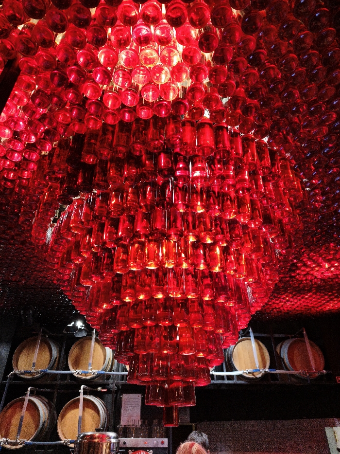 - "A chandelier made from numerous clear glass bottles, illuminated with a red light, hangs from a ceiling also covered in bottles" by FM-TGKtS2, licensed under CC BY 4.0
