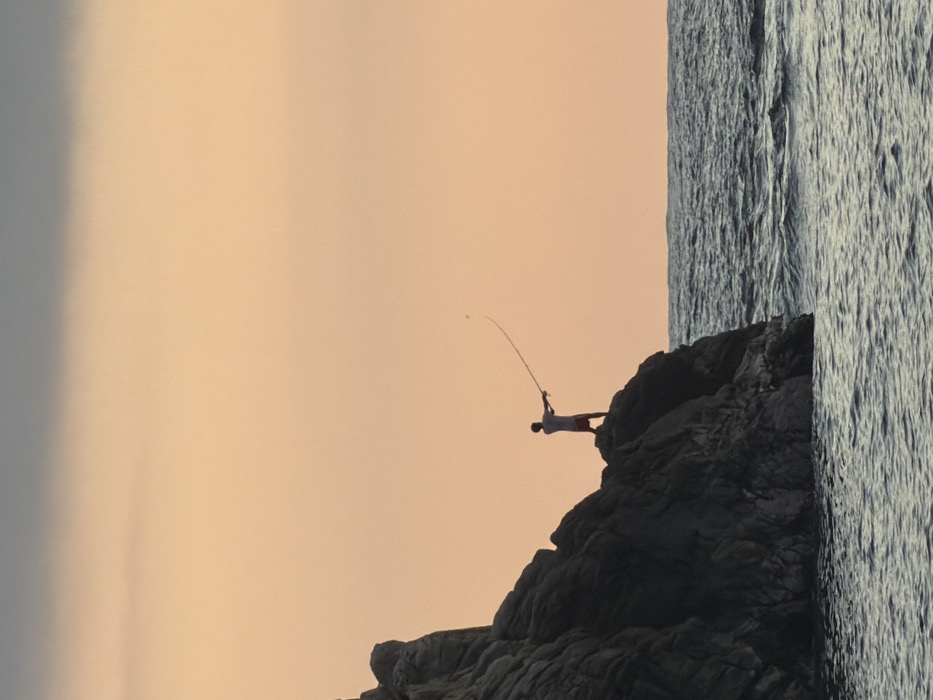 A man fishing off a rocky cliff, silhouetted against a hazy, orange sky, seemingly suspended in air. The cliff face appears rough and textured. A fishing rod is curved, extending out into the open space, with a lure visible. The right edge of the image shows an unclear, tall vertical textured section, possibly an illusion caused by the sea or a rock face. The image is oriented with the horizon vertically aligned.
