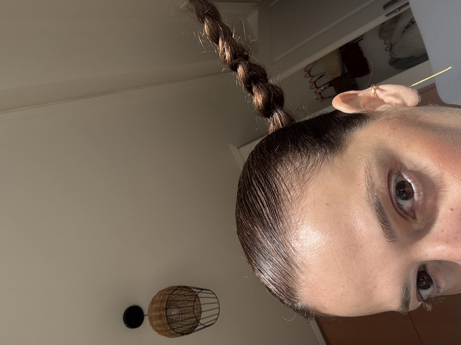 The image depicts a close-up of an individual within an indoor setting in Anavissos Municipal Unit, Greece. The subject is female, with dark brown hair slicked back from her forehead and styled into a high, tightly braided ponytail extending upwards and to the right. The visible portion of her face includes her forehead, right eyebrow, right eye with a brown iris, and the upper right cheek, which exhibits a reddish tone. Her right eye is directed towards the viewer. Her right ear is adorned with two gold-colored earrings: a small hoop on the upper helix and a long, thin, linear drop earring extending downwards from the lobe. In the upper left background, a ceiling-mounted light fixture is visible, featuring a black base, a woven wicker shade, and a black metal cage around the bulb. To the right of the subject's head, a partially visible open closet or shelving unit contains various items, including hanging garments and a pair of footwear. The background walls and ceiling are light-colored.