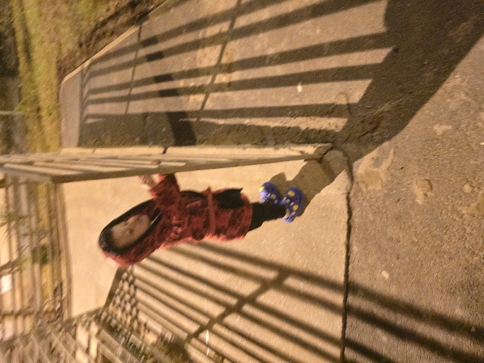 A child in a red coat sits on a park bench. The child wears blue sandals. The bench casts strong shadows onto the ground. The scene appears to be at night, lit by artificial light. The bench is made of metal slats. The ground is concrete. The child's face is visible within the hood of the coat. Vegetation is vaguely visible in the background.