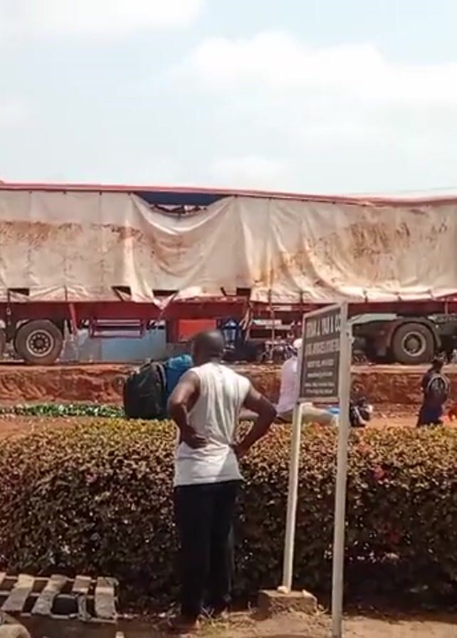 busy roadside scene in what appears to be a developing country. A large, red truck with a covered trailer is parked on a dirt lot, partially blocking a road. People are standing around and walking through the area. There are cars, motorcycles, and a van present, along with what seems to be construction work underway. The environment is dusty and the sky is overcast. In the background is a two-story building.