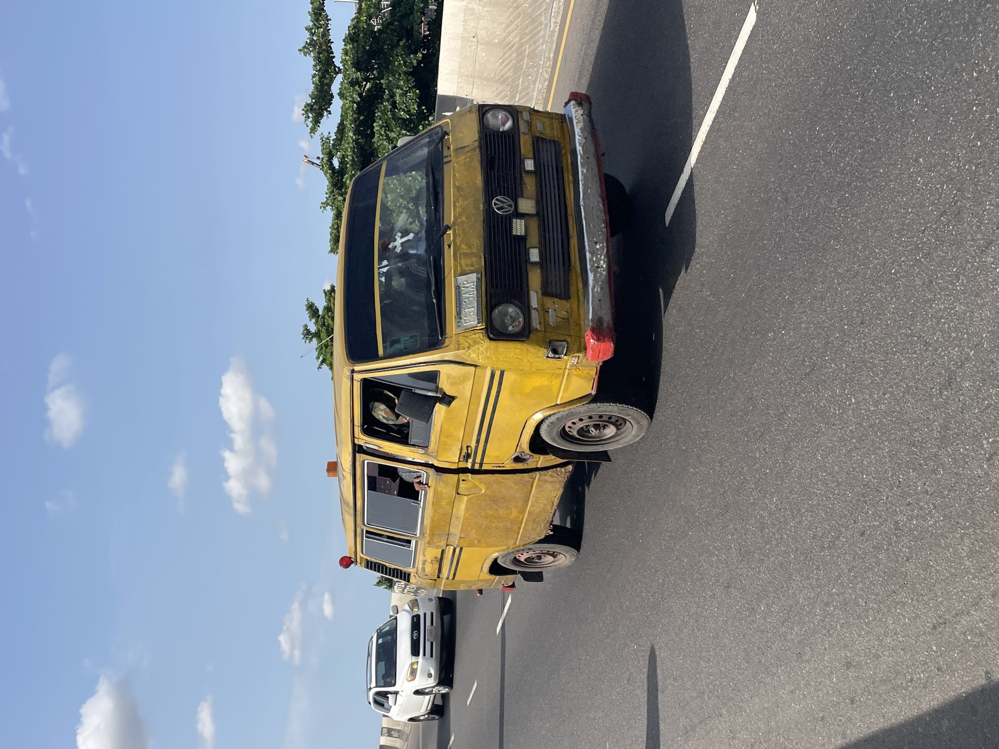On a clear day in Ikeja, Nigeria, a yellow Volkswagen bus with black stripes and a "FST 33LX" license plate travels on a gray asphalt road marked with white lines. Another white car is traveling on the road behind the bus. A person is visible inside the yellow bus. Trees line the side of the road. The sky is blue with scattered white clouds.