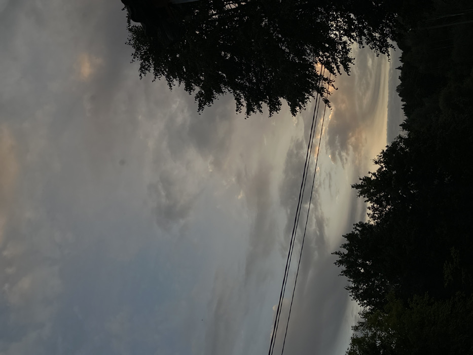 The image presents an outdoor scene at either dusk or dawn, observed from Tytuvėnai, Lithuania. The upper two-thirds of the frame are dominated by a cloudy sky, displaying a transition from light blue-grey on the left to darker grey and subtle orange-yellow tones towards the right, indicative of diffused sunlight near the horizon. Two dark, taut power lines traverse horizontally across the mid-left portion of the frame. The lower third features the dark silhouettes of numerous trees, forming a dense, indistinct treeline. On the far right, the upper branches and foliage of a large tree are visible, partially obscuring a dark roofline or structural element in the upper right corner. No individuals, discernible actions, or interactions are present within the scene.