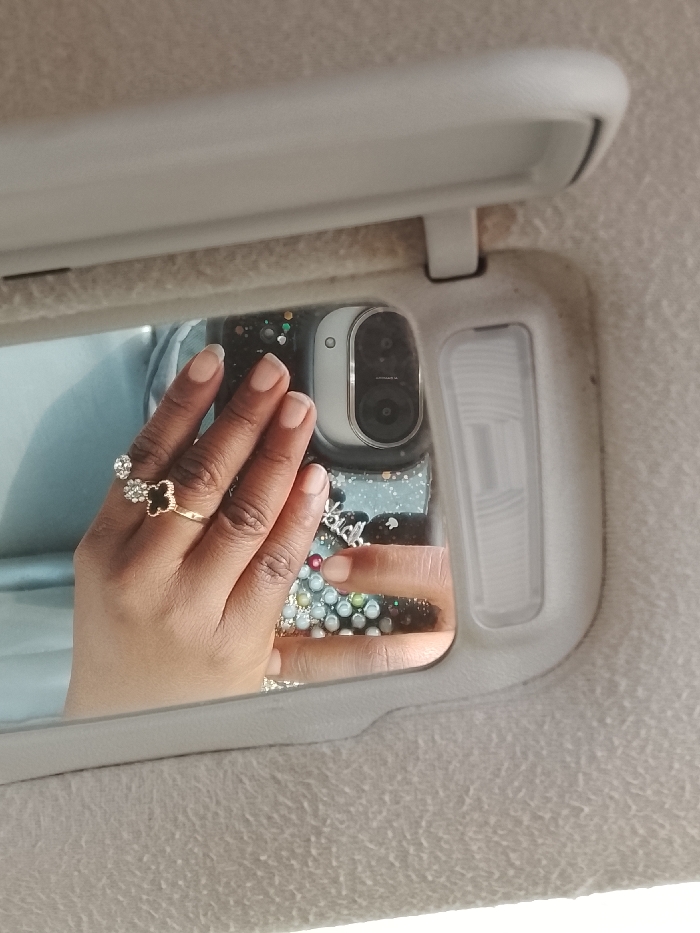 This image displays a reflection captured within a rectangular vanity mirror mounted on a light-colored, textured sun visor inside a vehicle. A rectangular light fixture is situated immediately adjacent to the right side of the mirror. The reflection shows a right human hand with brown skin tone, featuring manicured nails with light-colored tips. On the ring finger, a gold-colored ring with a black four-leaf clover design is visible. On the middle finger, a silver-colored ring adorned with multiple small, clear, clustered stones is present. The hand is holding a smartphone, the rear case of which is prominently reflected. The phone case is decorated with glitter and numerous small, spherical, multi-colored elements (white, light blue, green, pink). A metallic silver charm, partially visible on the case, appears to spell "kind." The smartphone's camera module is clearly reflected, presenting as a light grey rectangular housing containing two vertically aligned dark circular lenses. The specific location within Jos, Nigeria, is not discernible from the visual information provided within the image.