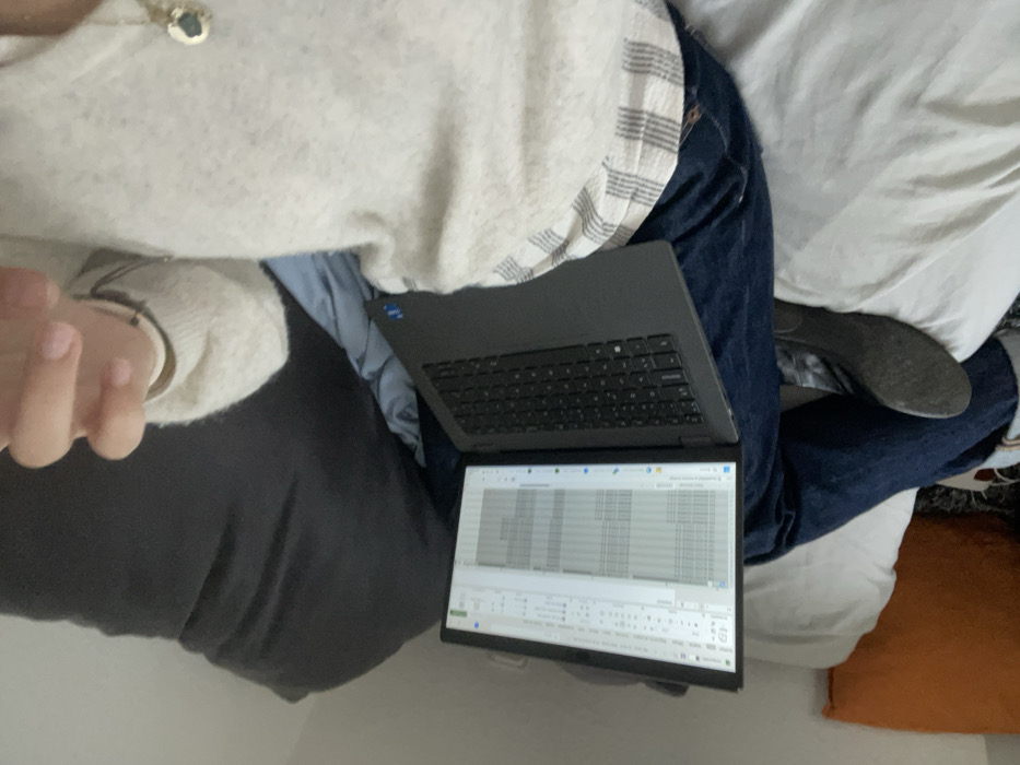 The image presents a close-up, top-down view of a person seated indoors in Cologne, Germany. The individual's upper torso, lap, and right foot are visible. They are wearing a light-colored fuzzy sweater over a striped undershirt, dark blue jeans, and a single dark grey flat shoe. A gold-colored necklace with an irregular pendant adorns their neck. A dark-colored laptop rests open on their lap; its illuminated screen, oriented vertically, displays a spreadsheet application with numerous visible rows and columns of data. The person's right hand is partially visible at the top of the frame. The immediate environment includes white bedding or cushions, a dark grey pillow positioned behind the person, a light blue fabric item, and a partial orange pillow visible on the left.