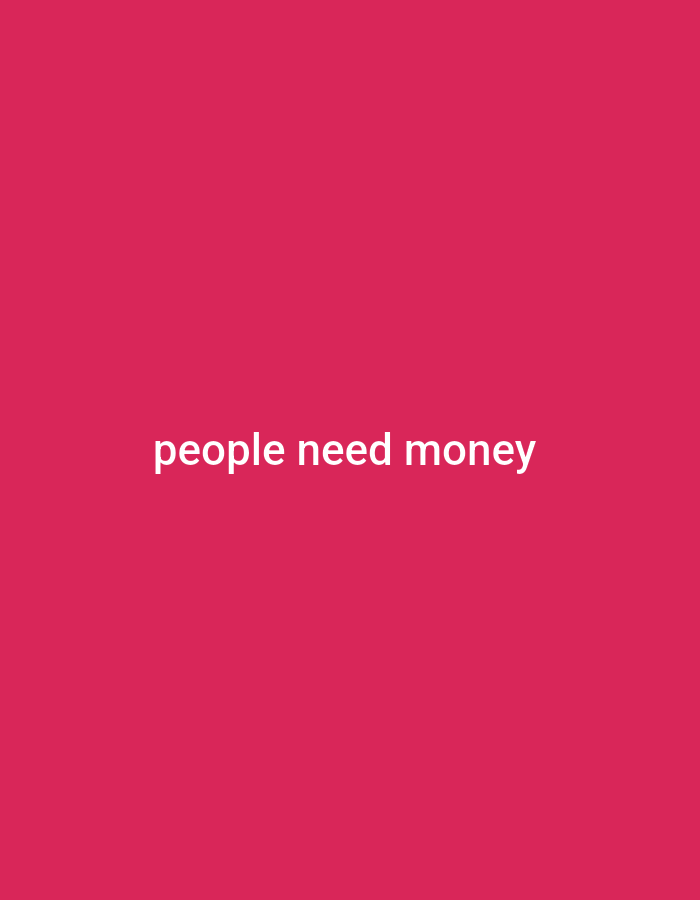 The image displays a solid fuchsia-pink background. Centered on this background, white sans-serif text reads, "people need money." No individuals, additional objects, specific actions, interactions, or environmental features are present. The image contains no visual information to determine a specific geographical location, including within Almaty, Kazakhstan.