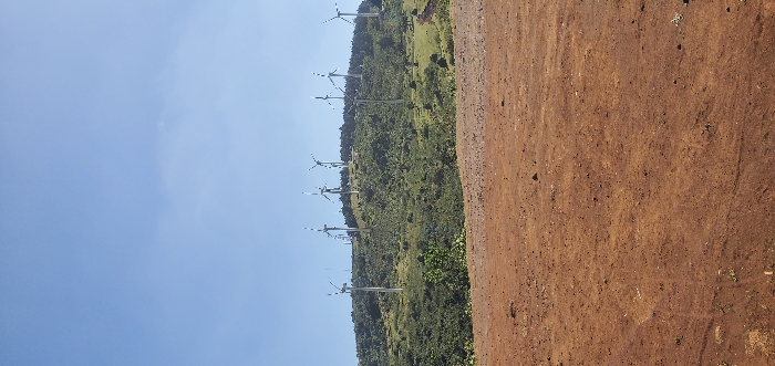 The image displays a landscape in Ewuaso Oonkidong'i ward, Kenya, under a clear blue sky. The foreground consists of an expanse of reddish-brown, unpaved earth, showing minor undulations and scattered small stones. In the midground, a prominent hill rises, densely covered with varied green vegetation, primarily appearing as scrubland or low bushes. Approximately ten white wind turbines are positioned along the crest of this hill. Their blades are observed in various orientations, with some appearing static and others potentially in motion. No human figures, animals, or man-made structures other than the wind turbines are visible in the scene. The lighting suggests daylight conditions.