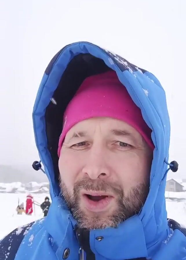 A man wearing a blue jacket with a hood and a pink beanie takes a selfie video while on a snowy field