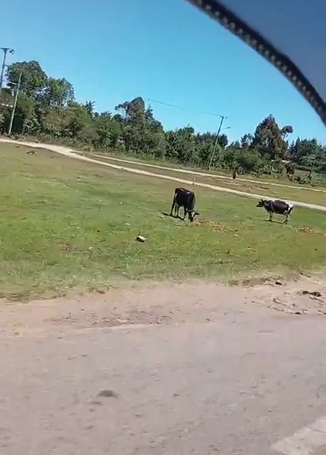 view from inside a moving vehicle, traveling on a dirt road alongside a green grassy field. There are a few cows grazing in the field under a bright blue sky. Telephone poles line the roadside. The road is uneven with patches and small rocks visible. The camera angle is from behind the vehicle's interior, framing a portion of the rearview mirror at the top of the view.