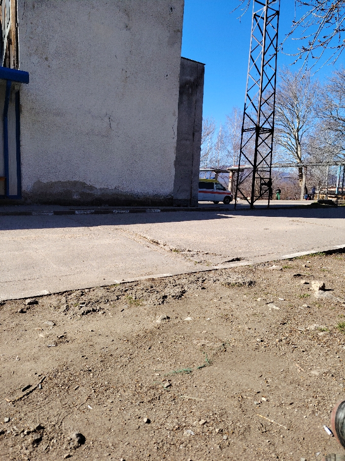 This image depicts an outdoor area in Karnare, Bulgaria, under a clear blue sky. The foreground consists of dry, uneven dirt and gravel, containing sparse vegetation, small rocks, a green plastic strand, and tire marks. A concrete or asphalt surface, exhibiting cracks, forms the immediate midground, separated from the dirt by a low curb. To the left, a portion of a light-colored, stuccoed building wall is visible, showing weathering and discoloration at its base, with a blue architectural element on its far left. Centrally, a tall, dark, lattice-structured metal tower rises. A white van with red and yellow/green striping is partially visible behind the building and the tower. The background features bare deciduous trees and distant rolling hills. Two small, indistinct human figures are present near the trees in the far background, one appearing to wear a green top. The scene is brightly lit by direct sunlight.