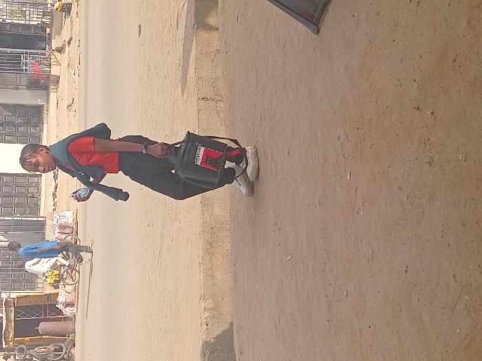 A young person stands on a sidewalk next to a road, holding a water bottle and a black bag. They wear a red shirt, black pants, and white shoes, with a dark sweater draped over their shoulders. The background includes buildings with barred windows and a man on a bicycle with goods. The sidewalk is light brown, and the road is a similar color. The scene is bathed in bright sunlight.