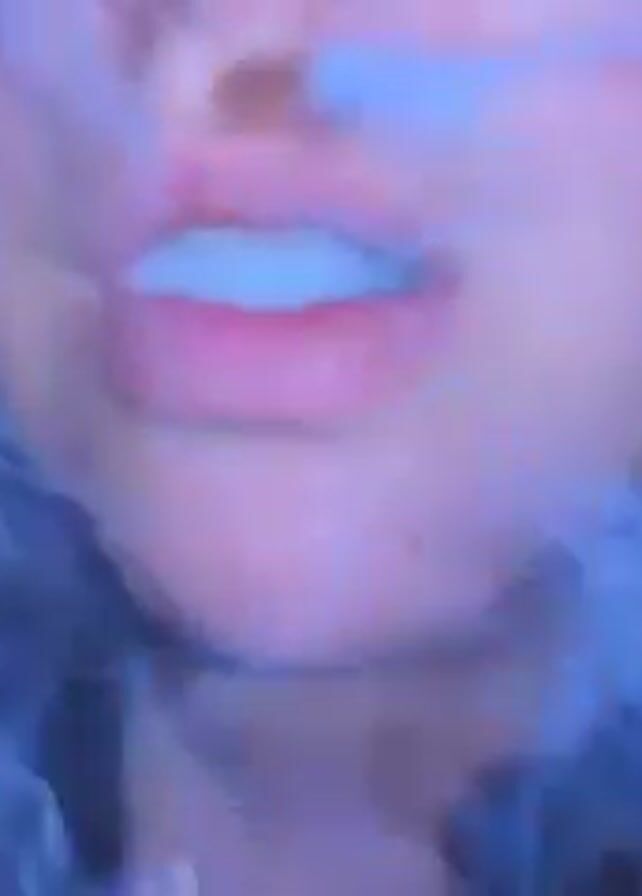 A woman with long brown hair holds a black object to her lips and exhales a cloud of white smoke. The shot is a close-up of the lower half of her face, including her mouth and chin. She has a ring on her finger and a colorful design on her fingernail. The lighting appears to be cool-toned, with a blue or purple hue.