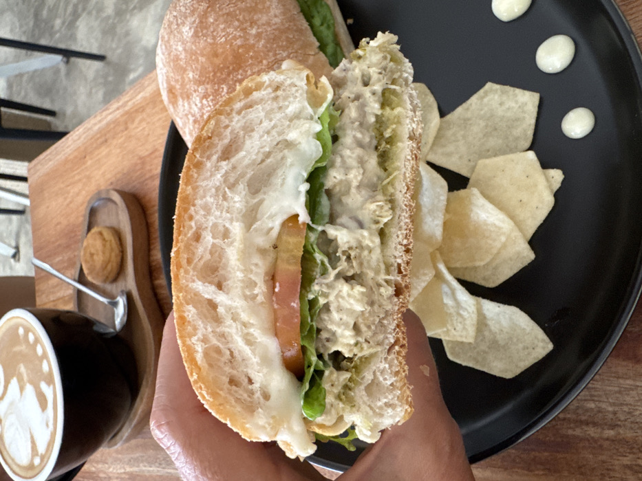 The image depicts a close-up scene of food items laid out on a wooden table in Panglao, Philippines. A light-skinned hand, positioned on the left side of the frame, holds a halved round sandwich, displaying its internal composition. The sandwich consists of a rustic bread roll with a light, airy crumb, filled from bottom to top with a green spread (possibly pesto), a substantial amount of shredded light-colored meat salad, green lettuce leaves, a sliced red tomato, and a layer of melted white cheese or creamy sauce. The sandwich is held above a black, matte-finish plate. On this plate, several light-colored potato chips are scattered, and three distinct, small, white dollops of a creamy condiment are visible on the lower right. Partially visible on the black plate to the right of the held sandwich is another, intact sandwich of the same type. In the upper left background, resting on a small, light-brown wooden serving tray, is a dark-colored ceramic cup containing a beverage with a white latte art design (resembling a leaf or swan). A small silver spoon is placed next to the cup, and a small, round, light-brown biscuit is also on the tray. The entire setup is situated on a light-brown wooden table with visible grain patterns. The background shows a light-colored floor surface and blurred outlines of light-colored furniture legs, suggesting an indoor or semi-outdoor cafe environment.