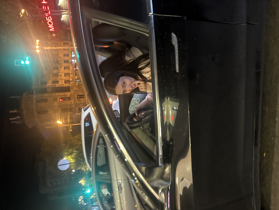The image displays a nighttime urban scene in Yerevan, Armenia, located near the intersection of Mesrop Mashtots Avenue and Amiryan Street. A young female with long dark hair is in the driver's seat of a black Tesla sedan, observed through the open driver's side window. She is looking towards the camera, smiling, with her right index finger touching her lower lip. Her attire appears to be a light-colored top. Another individual's dark hair is partially visible in the passenger seat behind her. The Tesla is stationary, positioned in traffic alongside other vehicles including a silver sedan and a white SUV visible to the left. A green traffic light is visible directly ahead in the background. Prominent multi-story stone buildings line the street. A distinctive building to the left features a rounded turret-like top section. To the right, a red neon sign on a building reads "MOBILE H...". Streetlights illuminate the environment, casting reflections on the vehicles. A circular white road sign is partially visible on the left side of the frame.
