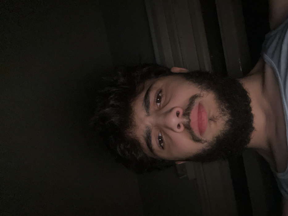 A man with dark hair and a full beard stares directly at the camera. The lighting is dim, casting a significant portion of the frame into shadow. His facial expression is serious. He appears to be wearing a light blue or gray tank top. The background is dark and partially obscured, showing what seems to be a plain wall with vertical lines. The image is rotated slightly to the left.
