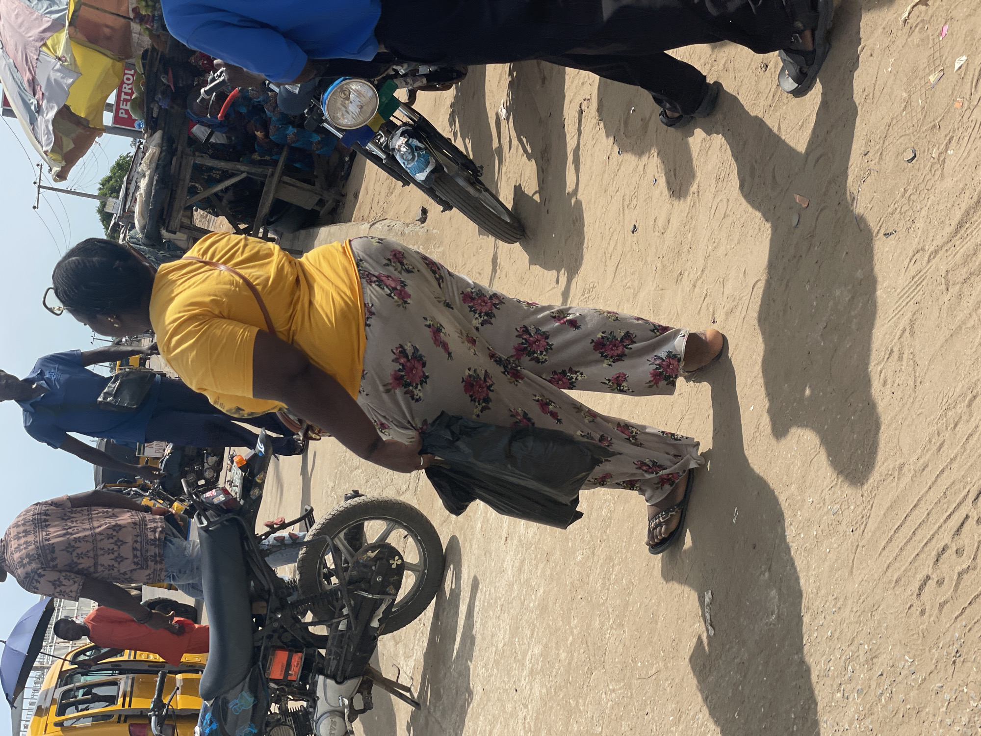 The image depicts an outdoor scene in Ajara, Nigeria, during daylight hours. A woman wearing a yellow shirt and floral pants is standing on a sandy ground near motorcycles and auto rickshaws. The scene appears to be a busy street with people nearby and a makeshift roadside petrol station. She's holding a black plastic bag. There are motorbikes nearby.