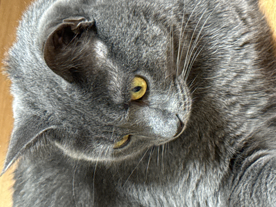 - "A close-up, high-angle view depicts a domestic cat with dense, slate-grey fur resting indoors" by FM-oYDji2, licensed under CC BY 4.0