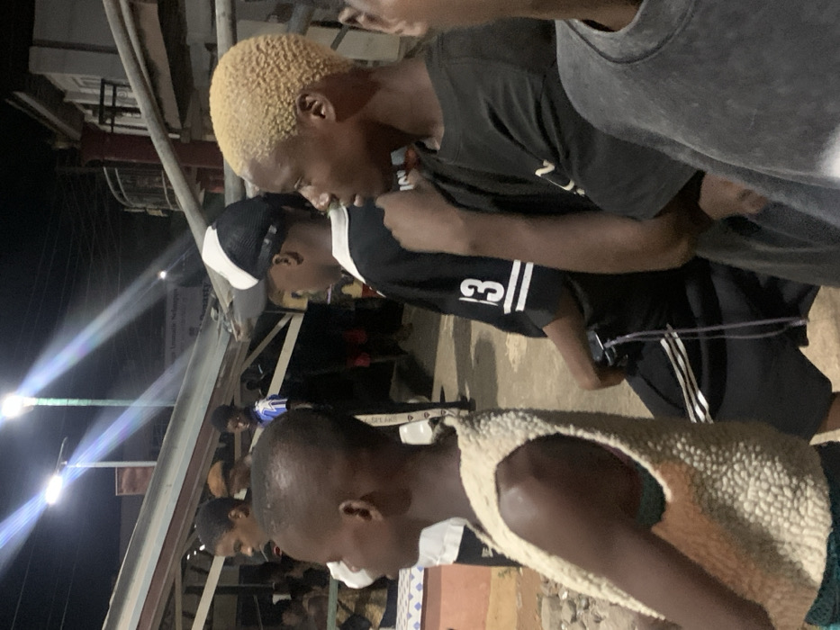 At night, a group of people are gathered outside under dim lighting. A person with bleached blonde hair is standing close to another wearing a black cap and a black shirt with the number 3. In the foreground, a child is wearing a light-colored vest. The crowd seems to be observing something happening in front of them.