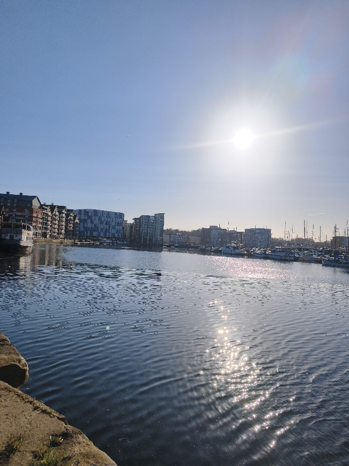 This image depicts the Ipswich Waterfront in Ipswich, United Kingdom, under a clear, bright blue sky