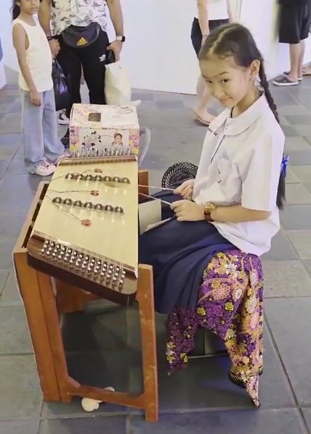 A young Asian girl sits on a low stool and plays a Khim, a Thai stringed instrument similar to a dulcimer. She is dressed in a white school uniform with a navy skirt and a blue ribbon in her hair. A colorful floral scarf is draped over her legs. The instrument is on a wooden stand. In front of her is a small box with an image on it, presumably for tips. Several people are walking around in the background, some looking at the girl. The setting appears to be a public space with tiled flooring, likely a mall or shopping center.