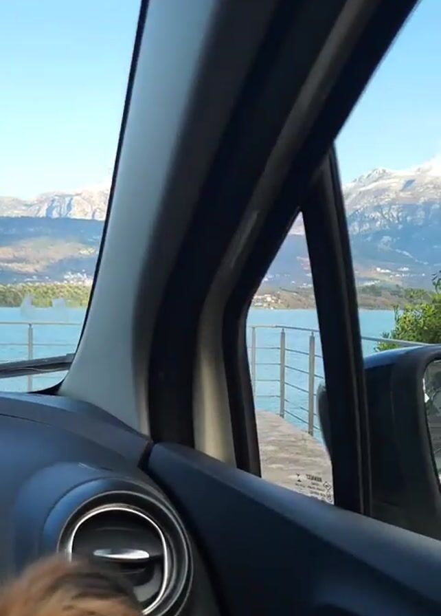 view from inside a car, looking out towards a body of water and a mountain in the distance. The water is calm and blue, reflecting the clear, bright sky above. A line of fencing runs along the edge of the water. In the background, a large mountain range is visible, partially covered with snow on its peak. A small town or settlement is nestled at the foot of the mountains. The interior of the car is partially visible, including the dashboard and an air vent. A small patch of fluffy brown fur appears near the bottom of the frame, possibly a pet dog. As the camera angle shifts slightly, a side mirror comes into view, reflecting the surrounding environment.