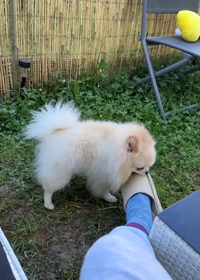A small, light-colored Pomeranian dog is playing with a person's slipper in a backyard. The dog is standing on grass and clover, gnawing at the slipper, which is on the person's foot. The person is wearing a light blue sock with a purple band, and white pants. They are sitting in a chair or lounger. A bamboo fence is visible in the background, along with a gray chair that has a yellow plush toy on it, and a small solar light. The yard is partially shaded.