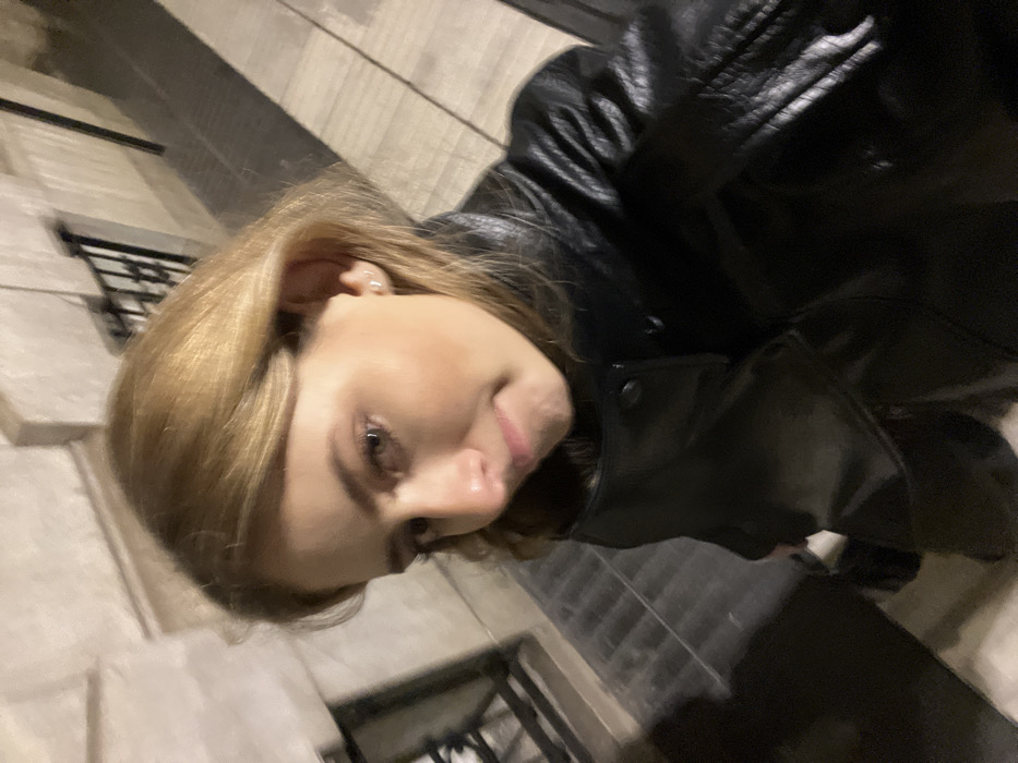 A woman with blonde hair poses in a selfie, wearing a black leather jacket. Her face is turned to the side, with a slight smile. The background shows stone tiles and a metal grate, suggesting an outdoor setting at night. The image is slightly tilted, adding a casual feel to the photograph.