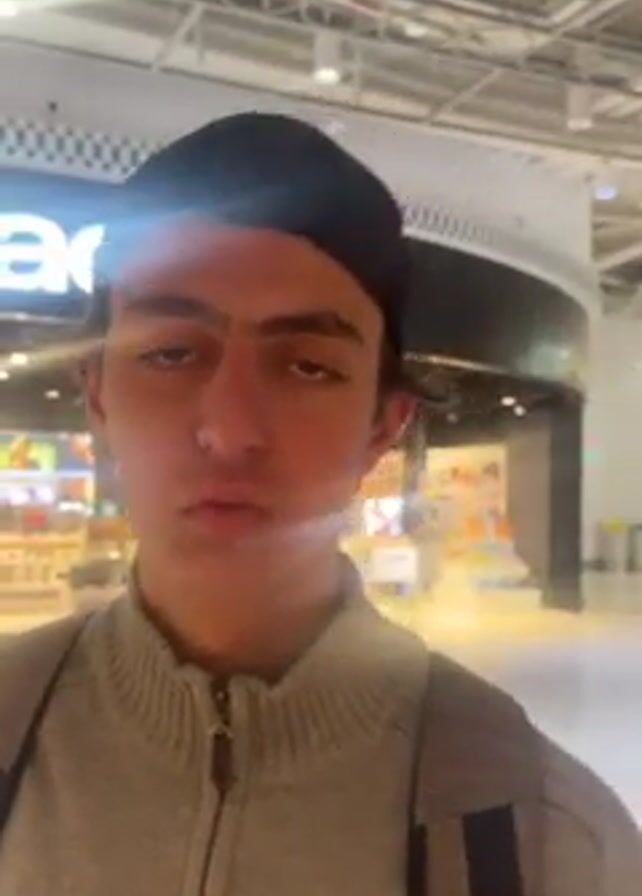 A young man with dark hair and eyes stands indoors, possibly in an airport or shopping mall. He is wearing a gray turtleneck sweater, a black cap, and a backpack. The camera is focused on his face. Behind him is a store with the word "ac" visible in its signage. Other stores and displays are visible in the background. The lighting is bright and artificial. The man's expression is neutral, and he appears to be looking directly at the camera.
