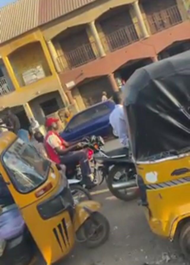street scene with several yellow auto rickshaws, motorcycles, and a dark pickup truck with people in the back