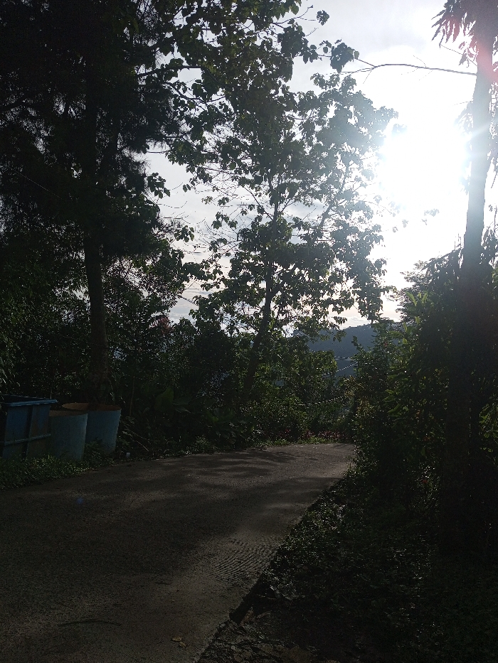 A sunlit road cuts through lush greenery. Trees frame the scene, their branches obscuring the bright sun. The road, mostly in shadow, curves uphill, hinting at distant hills. Vegetation thrives on both sides, creating a dense, verdant atmosphere. Two blue containers sit to the left, near the start of the road. The scene conveys a peaceful, natural setting bathed in sunlight.