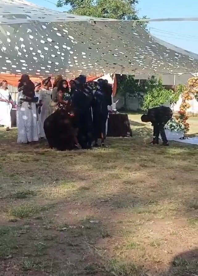 gathering of people in an outdoor space, possibly for a celebration or event. The scene is set on a grassy area, with a large white canopy overhead, decorated with patterns of cut-out circles. People of different ages, mostly women, are visible. They are dressed in a variety of outfits, including traditional African attire, with colors such as white and dark blue being prominent. Several individuals are congregated around a central point, where someone is kneeling or sitting on the ground, possibly receiving a blessing or participating in a ritual. In the background, there are tables and chairs set up, indicating a space for dining or socializing. To the side, there's a floral arrangement, suggesting a festive occasion. The sky is clear and blue, indicating a bright day.