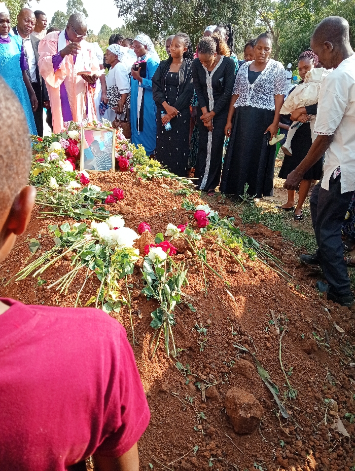 The image depicts an outdoor graveside scene in West Kabras ward, Kenya, likely during a funeral or memorial service